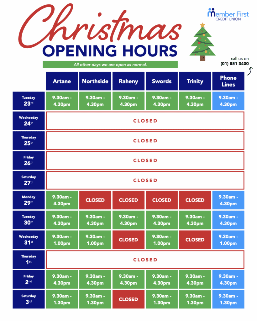 Christmas is a special time of year and, as always, the team at Member First Credit Union is here to support you over the festive season. To help you plan branch, payments and withdrawals, please take a moment to review our Christmas opening hours below.